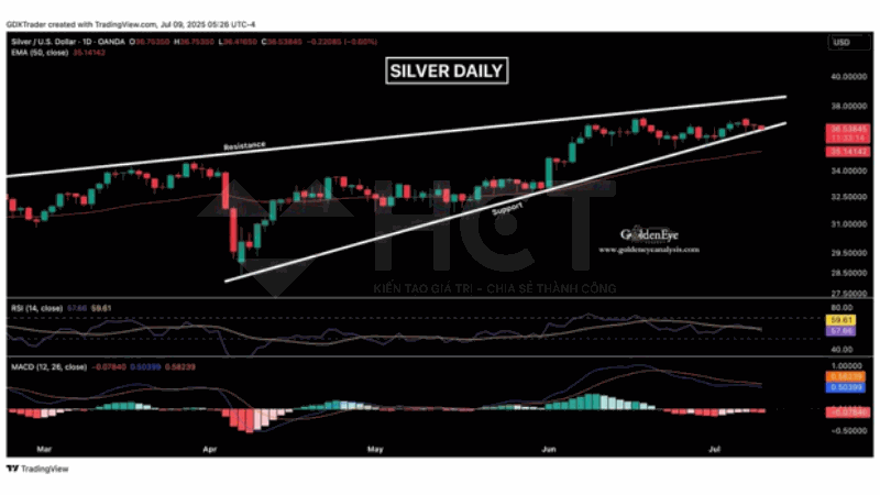 Bạc đang dao động gần hỗ trợ nêm tăng, với hai phiên liên tiếp cho thấy áp lực bán tăng dần. Nếu phe mua không phản ứng sớm, nguy cơ phá hỗ trợ và đảo chiều giảm sẽ cao hơn.