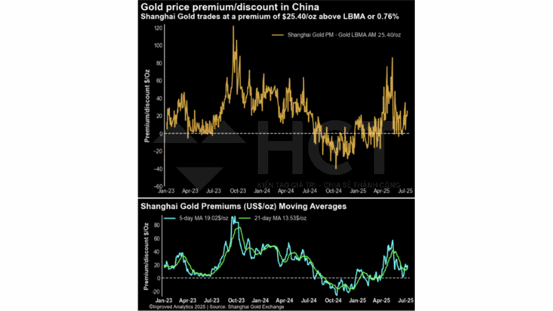 Giá vàng tại Trung Quốc tiếp tục duy trì mức chênh lệch cao so với thế giới. Cụ thể, ngày hôm qua, vàng Thượng Hải giao dịch cao hơn +25.4 USD/oz, tương đương +0.76% so với giá LBMA. Diễn biến này cho thấy nhu cầu trong nước vẫn ổn địnhdo tâm lý tích trữ vàng trong bối cảnh kinh tế Trung Quốc còn nhiều bất định.