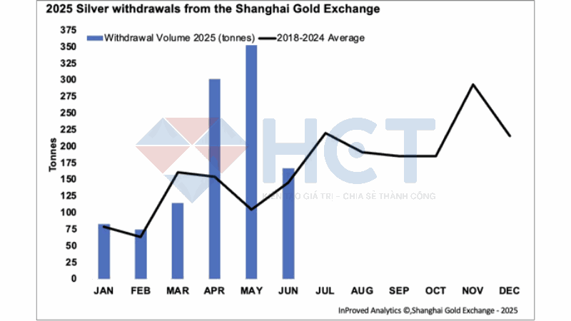 Lượng bạc rút khỏi Sàn Giao dịch Vàng Thượng Hải trong tháng 6 đạt 167 tấn, giảm mạnh 53% so với tháng trước, nhưng vẫn cao hơn 15% so với mức trung bình 7 năm theo mùa. Tính từ đầu năm đến nay, tổng lượng bạc rút đạt 1.095 tấn, tăng 26.5% so với cùng kỳ năm ngoái – cho thấy nhu cầu tích trữ bạc tại Trung Quốc đang tăng trưởng ổn định, bất chấp biến động ngắn hạn.