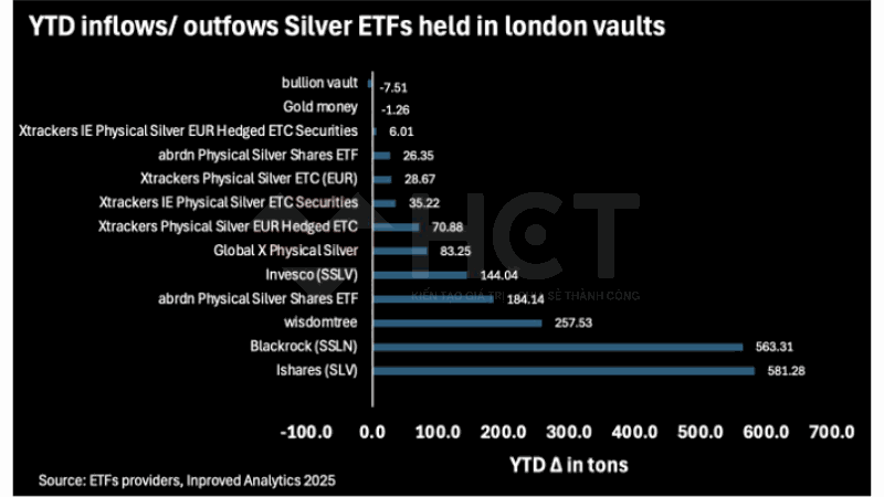 Các quỹ ETF bạc đã ghi nhận dòng tiền đổ vào mạnh mẽ, với tổng lượng bạc tăng thêm 1.972 tấn từ đầu năm đến nay. Đáng chú ý, hai quỹ lớn nhất là iShares ($SLV) và Blackrock ($SSLN) lần lượt dẫn đầu với lượng bạc đổ vào là 581 tấn và 563 tấn.