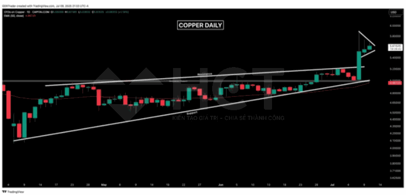Giá đồng đang tích lũy trong mô hình tam giác sau nhịp tăng mạnh. Xu hướng vẫn nghiêng về khả năng bứt phá lên nếu giá giữ trên hỗ trợ.