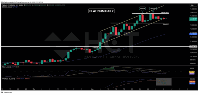 Bạch kim đang đi ngang trong vùng tích lũy hẹp với lực mua hỗ trợ nhưng chưa đủ mạnh để bứt phá. Xu hướng kỹ thuật hiện tại vẫn trung tính: phe mua chưa cần thoát lệnh, phe bán cũng chưa có lý do rõ ràng để vào lệnh cho đến khi giá phá vỡ hỗ trợ.