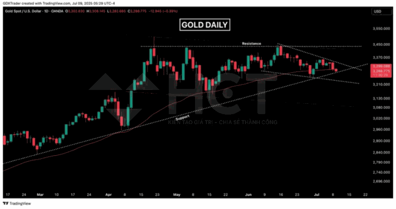 Vàng đang rơi dưới MA50 và tiến sát hỗ trợ tam giác tăng. Nếu hỗ trợ bị phá vỡ, xu hướng tăng sẽ mất hiệu lực ngắn hạn. Phe mua cần phản ứng nhanh, nếu không bên bán sẽ chiếm ưu thế và kéo giá xuống sâu hơn.