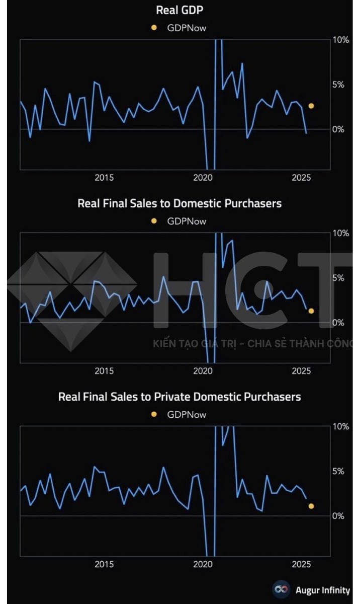 Tăng trưởng kinh tế Mỹ đang chậm lại rõ rệt, khi cả GDP thực tế, doanh số bán hàng trong nước và doanh số đến khu vực tư nhân đều suy yếu, tiệm cận mức 0%. Dự báo GDPNow cũng cho thấy kỳ vọng tăng trưởng thấp trong ngắn hạn, phản ánh động lực tiêu dùng nội địa và khu vực tư nhân đang giảm tốc.
