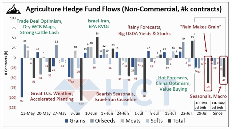 1. Các quỹ phi thương mại đã tiếp tục gia tăng hoạt động bán ra trên thị trường ngũ cốc và dầu hạt trong tuần qua. Theo báo cáo COT tuần trước, xu hướng bán xuất phát từ điều kiện thời tiết mát mẻ và ẩm ướt hơn, làm giảm lo ngại về rủi ro nguồn cung. Đến cuối tuần, áp lực bán tiếp tục gia tăng khi tâm lý thị trường xấu đi sau khi dữ liệu việc làm yếu kém của Mỹ được công bố vào thứ Sáu, kéo theo đà giảm trên các hợp đồng tương lai nông nghiệp.