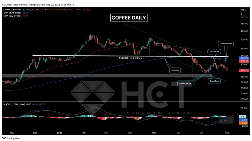 Đà giảm hiện còn được hỗ trợ bởi yếu tố kỹ thuật, khi chỉ báo MACD chuẩn bị cho tín hiệu cắt xuống, báo hiệu rủi ro giảm giá tiếp diễn. Chừng nào giá chưa thể quay trở lại và vượt lên trên kênh giảm, thị trường cà phê chưa xuất hiện cơ sở kỹ thuật đủ mạnh để ủng hộ xu hướng tăng trở lại.