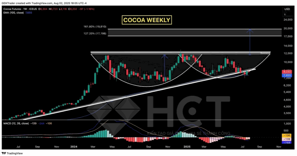 1. Thị trường ca cao đang trong giai đoạn hình thành mô hình “cốc và tay cầm”, nhưng xu hướng này có nguy cơ bị phá vỡ khi giá liên tục dao động gần vùng hỗ trợ quan trọng. Trong tuần trước, nến tuần xuất hiện dạng “spinning top” với bóng trên dài ngay tại ngưỡng kháng cự, phản ánh sự do dự của nhà đầu tư và áp lực bán khi giá tăng lên cao.