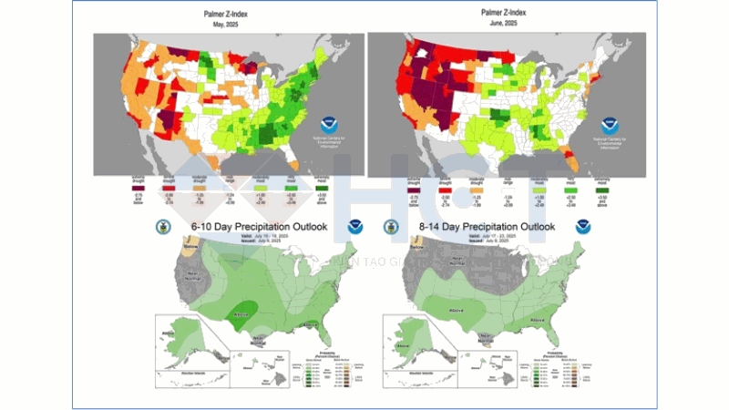 3. Độ ẩm đất tại các vùng trồng trọt chính, đặc biệt là khu vực Trung Tây Mỹ, đang giảm rõ rệt từ tháng 5 sang tháng 6, với nhiều nơi rơi vào tình trạng khô hạn nghiêm trọng. Tuy nhiên, dự báo thời tiết trong 6–14 ngày tới cho thấy khả năng xuất hiện mưa ở nhiều khu vực, mang lại hy vọng cải thiện điều kiện canh tác. Tháng 7 và đầu tháng 8 là giai đoạn then chốt quyết định năng suất cuối vụ, vì vậy lượng mưa sắp tới sẽ đóng vai trò quan trọng trong việc ổn định hoặc nâng cao sản lượng ngô và đậu nành năm nay.