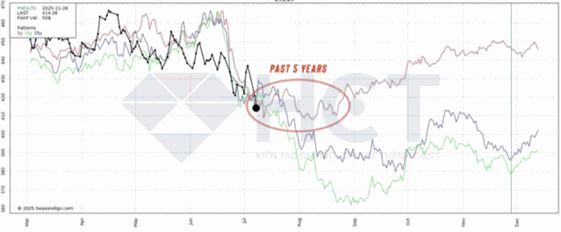 2. Lịch sử cho thấy giá ngô thường giảm trong tháng 7, nhưng mức giảm không quá mạnh trong 5 năm gần đây, thường chạm đáy rồi đi ngang hoặc giảm nhẹ đến tháng 8. Ngược lại, xu hướng 10 và 15 năm cho thấy đà giảm kéo dài đến tháng 9. Gần đây, thị trường có xu hướng tạo đáy sớm và ít biến động hơn trước mùa thu hoạch.