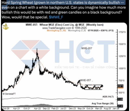 7. Lúa mì vụ xuân tại miền Bắc nước Mỹ đang cho tín hiệu kỹ thuật tích cực. Biểu đồ cho thấy giá thoát khỏi vùng tích lũy kéo dài, cho thấy khả năng bước vào xu hướng tăng mới. Xu hướng này càng rõ nét dù chỉ hiển thị trên nền trắng – cho thấy lực mua đang chiếm ưu thế.