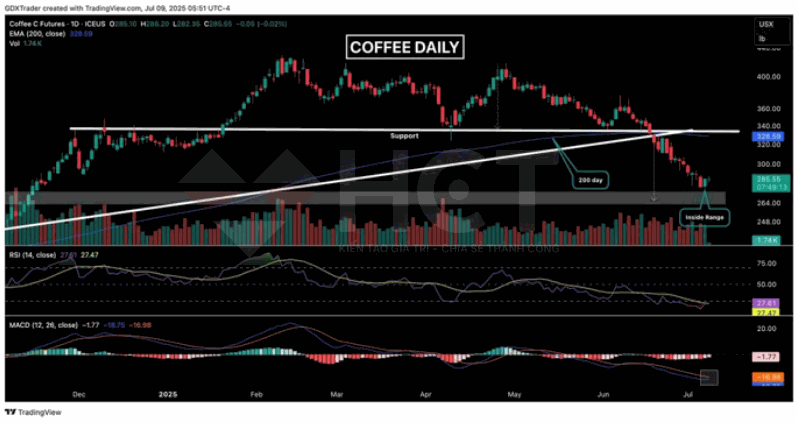 1. Giá cà phê đang cho thấy dấu hiệu có thể đảo chiều tăng. Sau phiên tích lũy hôm thứ Ba với nến inside bar,thứ Tư giá hình thành nến doji gần vùng hỗ trợ cho thấy tâm lý thị trường đang chuyển hướng. Giá cần đóng cửa vượt đỉnh phiên thứ Ba, để lực mua có thể quay trở lại và kích hoạt nhịp phục hồi. Đây là tín hiệu kỹ thuật đáng chú ý, có thể mở ra cơ hội giao dịch từ vùng đáy.