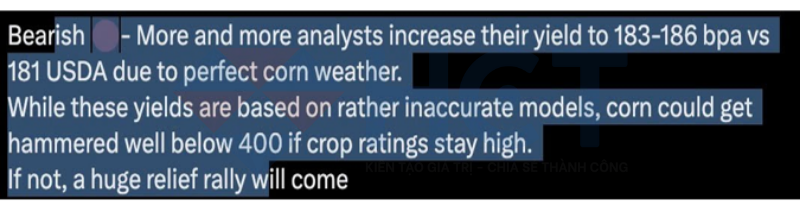 4. Nhiều nhà phân tích đang nâng dự báo năng suất ngô lên 183–186 giạ/mẫu, so với mức 181 do USDA đưa ra, nhờ điều kiện thời tiết lý tưởng. Mặc dù những ước tính này dựa trên các mô hình còn thiếu chính xác, giá ngô vẫn có thể giảm sâu dưới mốc 400 nếu chất lượng mùa vụ tiếp tục được đánh giá cao. Ngược lại, nếu chất lượng giảm, thị trường có khả năng sẽ chứng kiến một đợt phục hồi mạnh mẽ.
