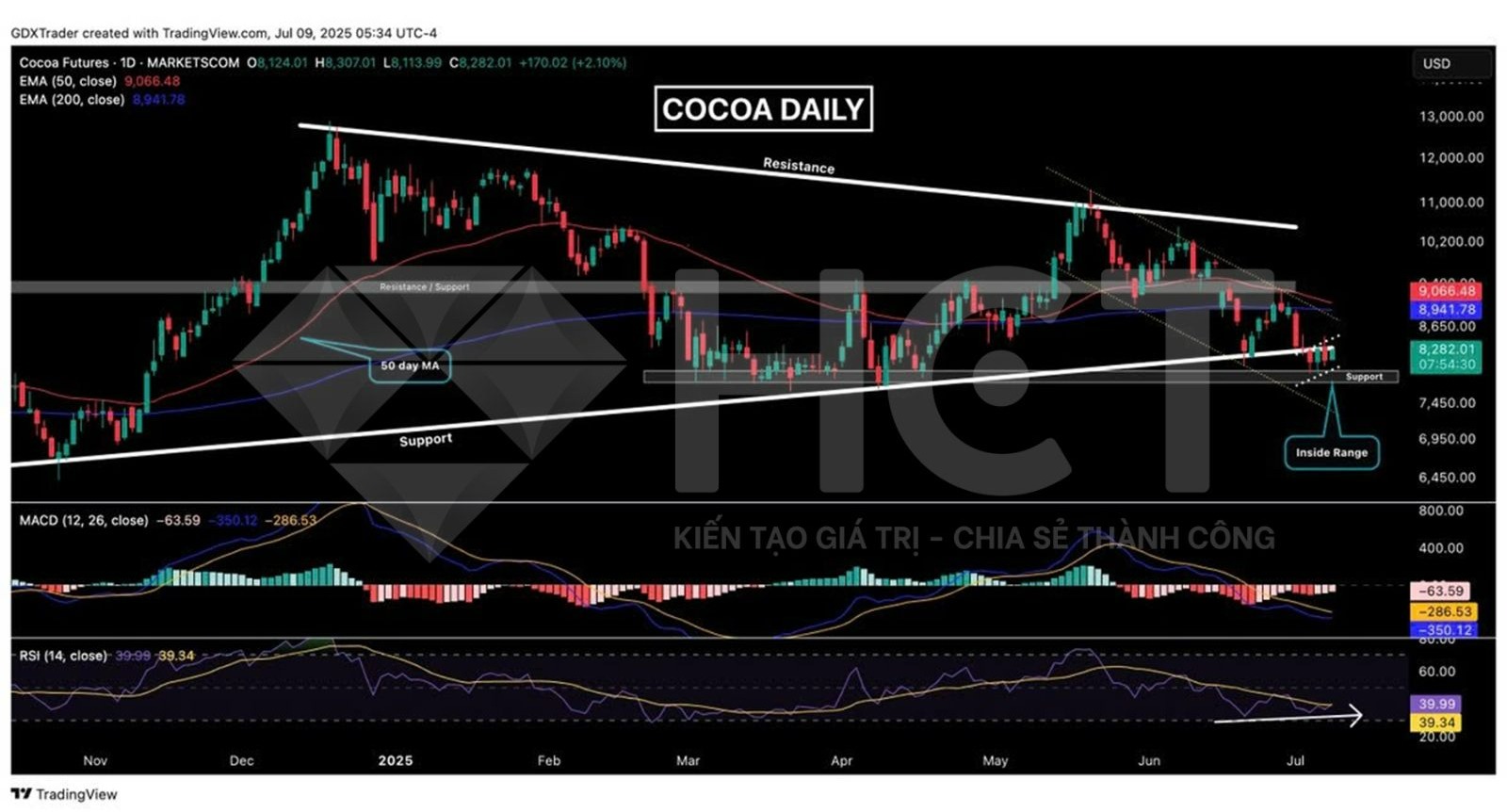 2. Giá ca cao đang kiểm định lại vùng hỗ trợ quan trọng quanh mốc $8200 nơi từng giữ vai trò nâng đỡ mạnh trong năm 2024 và đầu 2025. Nến inside bar tăng giá hôm thứ Tư cho thấy phe mua bắt đầu phản ứng, cố gắng chặn đà giảm và giữ đường hỗ trợ đi lên. Tuy nhiên, chưa có tín hiệu đảo chiều rõ ràng. Thị trường cần một cây nến xác nhận trong phiên tới để củng cố cơ hội phục hồi. Nếu không thể phá vỡ mô hình “cờ giảm”, áp lực vẫn nghiêng về xu hướng đi xuống. Bất kỳ nhịp bật nào từ đây cũng cần đi kèm lực mua mạnh để củng cố niềm tin từ phe mua.