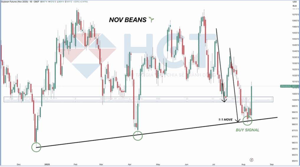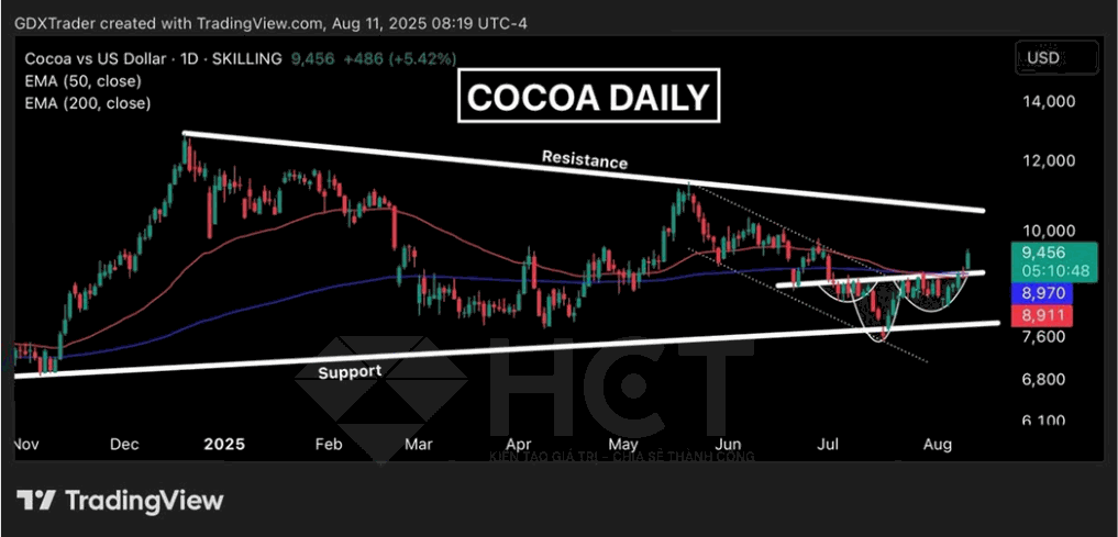 1. Giá ca cao đã chính thức vượt qua mô hình vai–đầu–vai ngược hình thành từ cuối tháng 7, xác nhận tín hiệu đảo chiều tăng giá. Phiên giao dịch thứ Hai ghi nhận cây nến tăng mạnh, bứt phá dứt khoát qua đường viền cổ và vượt lên trên các đường trung bình động quan trọng, cho thấy lực mua đã chiếm ưu thế và đà tăng đang được củng cố. Diễn biến này không chỉ khẳng định sự kiên nhẫn của những nhà đầu tư đã mua vào sớm, mà còn kích thích thêm lực mua từ những nhà giao dịch chờ tín hiệu xác nhận. Với các ngưỡng kháng cự quan trọng đã bị chinh phục, mục tiêu tiếp theo được hướng tới là đường kháng cự giảm dần phía trên, nơi thị trường sẽ kiểm định khả năng duy trì đà tăng cho nhịp bứt phá tiếp theo.