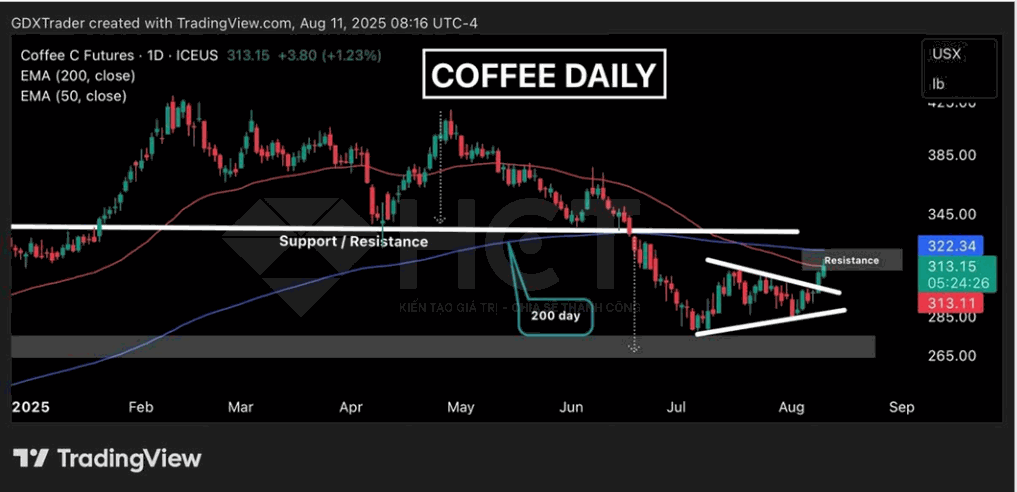 2. Sau khi bứt phá khỏi mô hình cờ đuôi nheo vào cuối tuần trước, giá cà phê tiếp tục tăng trong phiên thứ Hai và tiến sát đường trung bình động 50 ngày. Hiện giá đang tiếp cận vùng kháng cự hình thành bởi sự hội tụ của các đường trung bình động, nơi nhiều khả năng sẽ xuất hiện giai đoạn tích lũy hoặc điều chỉnh. Động thái này phản ánh sức mạnh tăng giá tiềm ẩn, nhưng cũng đòi hỏi các nhà giao dịch đã có vị thế cần quản trị rủi ro chặt chẽ. Về mặt tâm lý, phe mua kỳ vọng giá giữ vững trong vùng giữa các đường trung bình động và hình thành mô hình tiếp diễn ổn định, cho thấy lực mua hấp thụ tốt áp lực bán trước khi tạo đà cho một nhịp tăng mới. Đây là thời điểm cần duy trì sự thận trọng.