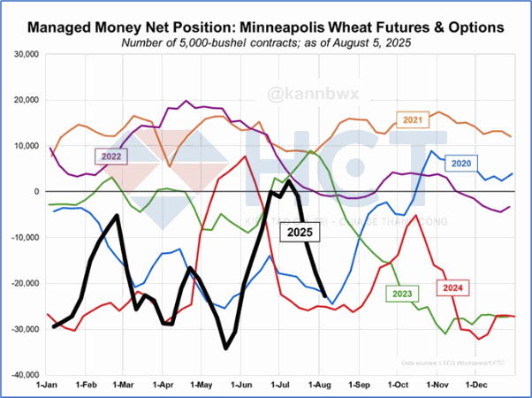 2. Vụ thu hoạch lúa mì xuân tại Mỹ vừa bắt đầu, với 49% diện tích được đánh giá ở mức tốt đến xuất sắc, thấp hơn đáng kể so với mức 72% của cùng kỳ năm ngoái. Tháng trước, Bộ Nông nghiệp Mỹ (USDA) dự báo năng suất chỉ giảm 1,5% so với kỷ lục năm ngoái, song các nhà phân tích hiện cho rằng sản lượng có thể sụt nhẹ so với ước tính này. Dù vậy, các quỹ đầu tư vẫn không bày tỏ lo ngại.