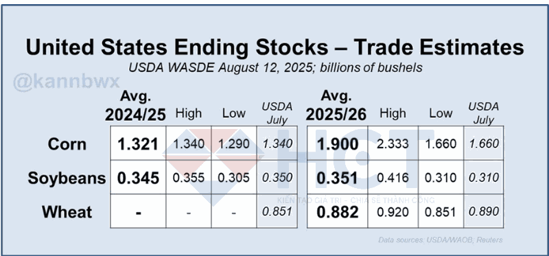 1. Bộ Nông nghiệp Mỹ (USDA) dự kiến sẽ nâng dự báo tồn kho ngô cuối vụ niên vụ 2025/26 trong báo cáo công bố vào thứ Ba, nhờ sản lượng ngô được dự báo tăng mạnh. Nếu mức tăng 44% so với cùng kỳ năm trước thành hiện thực, đây sẽ là mức tăng lớn nhất kể từ niên vụ 2013/14 và cũng là mức cao nhất từng được công bố trong tháng 8 kể từ niên vụ 2023/24.
