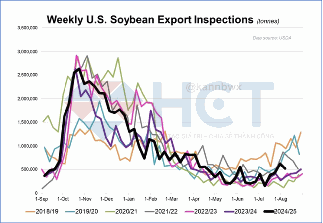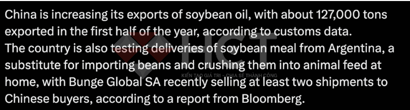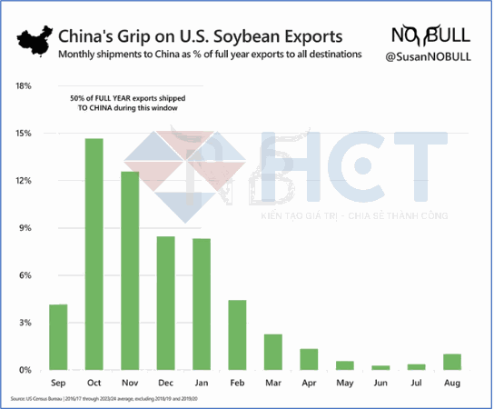 7. Trung Quốc đang đa dạng hóa nguồn cung và phương thức nhập khẩu các sản phẩm từ đậu tương. Ngoài việc tăng mạnh xuất khẩu dầu đậu tương (127.000 tấn trong nửa đầu năm) và thử nghiệm nhập khẩu khô đậu tương từ Argentina để thay thế việc nhập khẩu hạt thô, Trung Quốc còn duy trì vai trò thị trường tiêu thụ lớn đối với đậu tương Mỹ. Tuy nhiên, biểu đồ xuất khẩu cho thấy hoạt động mua của Trung Quốc tập trung cao điểm trong giai đoạn từ tháng 10 đến tháng 1, chiếm khoảng 50% tổng kim ngạch cả năm, sau đó giảm mạnh về mức rất thấp từ tháng 3 trở đi. Trung Quốc có chiến lược mua hàng có tính mùa vụ rõ rệt, đồng thời cho thấy khả năng họ đang tìm cách giảm phụ thuộc vào nguồn cung Mỹ bằng cách mở rộng sang các sản phẩm chế biến sẵn và đa dạng hóa đối tác thương mại.