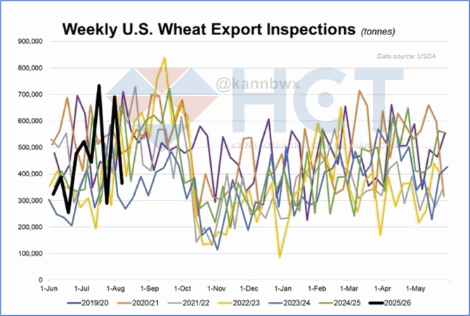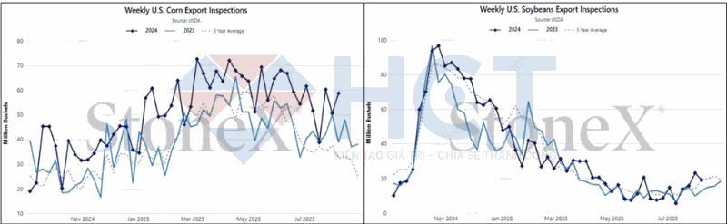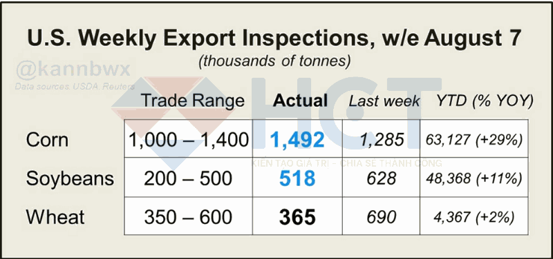 4. Tuần trước, doanh số kiểm tra xuất khẩu ngô và đậu tương của Mỹ đều vượt mọi dự báo của thị trường, trong khi lúa mì chỉ đạt mức thấp nhất trong khoảng ước tính. Không có lô hàng nào được kiểm định để xuất sang Trung Quốc.