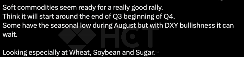 3. Nhận định thị trường cho thấy nhóm nguyên liệu công nghiệp đang ở trạng thái sẵn sàng cho một đợt tăng giá mạnh, với thời điểm khởi đầu nhiều khả năng rơi vào cuối quý III hoặc đầu quý IV. Thông thường, một số mặt hàng trong nhóm này đạt mức đáy theo mùa vào tháng 8, tuy nhiên xu hướng tăng của chỉ số DXY (đô la Mỹ) có thể khiến thời điểm này bị lùi lại. Hiện tại, sự chú ý của thị trường tập trung vào các mặt hàng chủ chốt gồm lúa mì, đậu tương và đường.