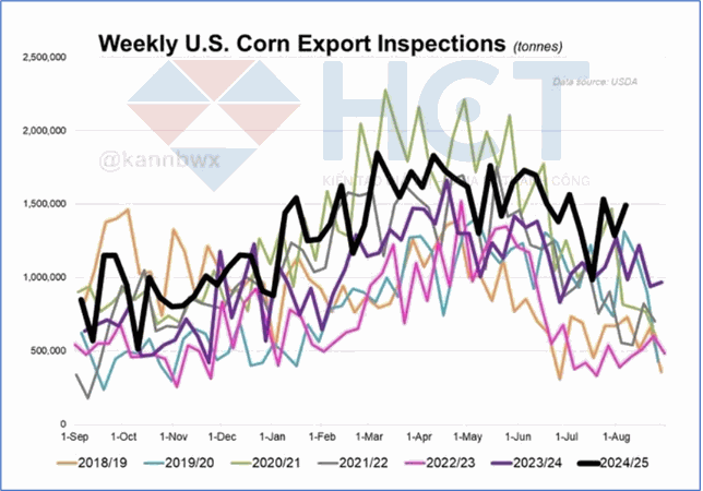 6. Doanh số kiểm tra xuất khẩu của ngô (58,7 triệu giạ) và đậu tương (19,0 triệu giạ) đều vượt mức dự báo cao nhất của thị trường. Cả hai mặt hàng hiện vẫn duy trì tiến độ cao hơn nhiều so với mức cần thiết theo mùa để đạt mục tiêu xuất khẩu của USDA, đặc biệt là ngô. Câu hỏi đặt ra là liệu USDA có ghi nhận điều này trong báo cáo công bố ngày mai hay không.
