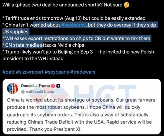 8. Căng thẳng thương mại Mỹ – Trung tiếp tục xoay quanh mặt hàng đậu tương và công nghệ. Mặc dù Tổng thống Donald Trump bày tỏ kỳ vọng Trung Quốc sẽ tăng gấp bốn lần đơn đặt hàng đậu tương Mỹ nhằm giảm thâm hụt thương mại, thực tế nước này lại ưu tiên mua đậu tương từ Brazil. Thỏa thuận đình chiến thuế giữa hai bên sẽ hết hạn vào ngày hôm nay và được gia hạn thêm 90 ngày. Trung Quốc không thực sự lo thiếu đậu tương, song việc bỏ qua nguồn cung Mỹ khiến họ phải trả giá cao hơn. Song song đó, Nhà Trắng nới lỏng hạn chế xuất khẩu chip sang Trung Quốc nhưng vẫn muốn áp thuế, trong khi truyền thông nhà nước Trung Quốc công kích chip Nvidia. Ngoài ra, ông Trump nhiều khả năng sẽ không đến Bắc Kinh vào ngày 3/9 mà thay vào đó tiếp tân Tổng thống Ba Lan tại Nhà Trắng.