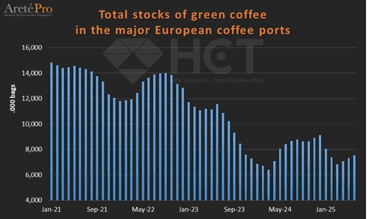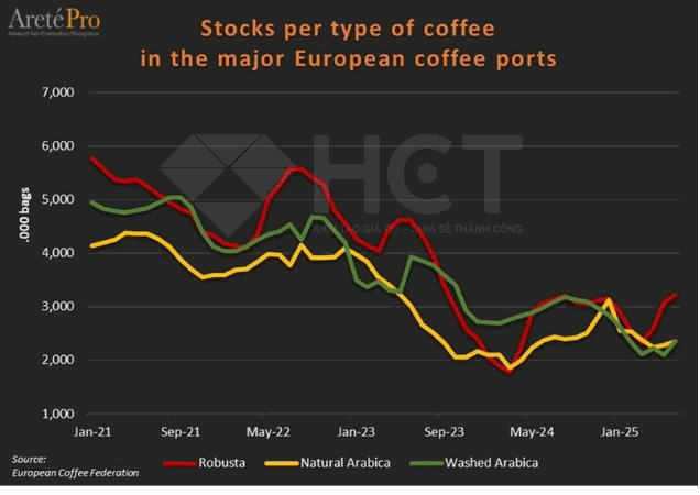 4. Dữ liệu cho thấy dự trữ cà phê xanh tại các cảng lớn của châu Âu đã giảm đáng kể so với trước đây. Cụ thể, tổng lượng tồn kho biến động theo thời gian nhưng giảm mạnh từ giữa năm 2023 và duy trì ở mức thấp. Xét theo từng chủng loại, cả Robusta, Arabica tự nhiên và Arabica rửa đều ghi nhận xu hướng giảm rõ rệt từ giữa năm 2022 đến cuối năm 2023, sau đó duy trì ở mức thấp và chỉ mới xuất hiện tín hiệu tăng nhẹ trong thời gian gần đây.