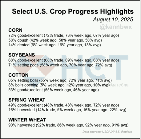 3. Tại Mỹ, chất lượng ngô và đậu tương trong tuần này giảm 1 điểm phần trăm như dự báo, trong khi bông giảm 2 điểm. Tiến độ thu hoạch lúa mì xuân diễn ra nhanh hơn một chút so với dự đoán, nhưng vẫn chậm hơn mức trung bình. Thu hoạch lúa mì đông gần như đã hoàn tất, và việc gieo trồng cho niên vụ 2026/27 cũng sắp bắt đầu.