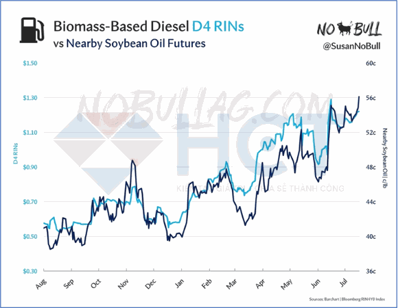 3. Dầu đậu tương đang có diễn biến rất mạnh, tăng 2.5% chỉ trong thứ Năm và tích lũy mức tăng 18% kể từ khi EPA công bố đề xuất cắt giảm chỉ tiêu pha trộn nhiên liệu sinh học (RVO/RIN) cho giai đoạn 2026–2027 vào ngày 13/6.