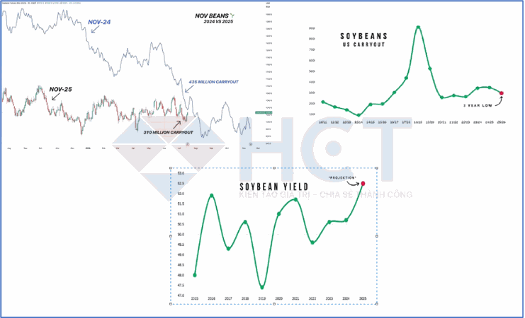 2. Có cơ sở để cho rằng giá đậu tương hiện tại đang bị định giá thấp. So với cùng kỳ năm ngoái, tồn kho cuối kỳ giảm gần 30% (310 triệu giạ so với 435 triệu), trong khi giá lại thấp hơn. Năm ngoái, giá sàn ở mức $9.60 dù tồn kho cao hơn đáng kể. Dự báo tồn kho mới ở mức thấp nhất trong 3 năm, ngay cả khi đạt năng suất kỷ lục 52.5 giạ/mẫu một mức mà chúng ta chưa từng vượt qua trước đây, cho thấy tiềm năng tăng giá là có cơ sở.