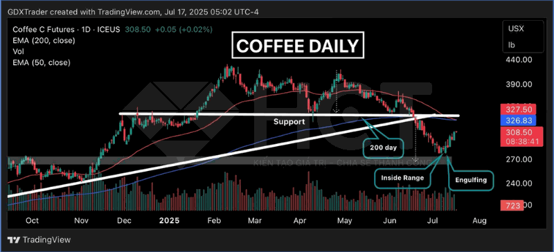1. Giá cà phê đã bật tăng trở lại sau mô hình nến nhấn chìm tăng từ vùng hỗ trợ quan trọng, cho thấy lực mua quay lại. Tuy nhiên, mô hình hai đỉnh nến bằng nhau, biên độ hẹp xuất hiện thứ Năm cho thấy đà tăng có dấu hiệu suy yếu khi giá tiếp cận vùng kháng cự. Hai đường trung bình động 50 ngày và 200 ngày vẫn trong xu hướng giảm, với nguy cơ hình thành giao cắt tử thần, tiếp tục tạo áp lực kỹ thuật. Trong bối cảnh này, nhà đầu tư nên chuyển sang quản lý rủi ro chốt lời từng phần và dời điểm dừng lỗ để bảo vệ thành quả khi giá đối mặt các ngưỡng cản. Phe mua cần duy trì lực và đóng cửa phiên mạnh để vô hiệu hóa tín hiệu suy yếu hiện tại.