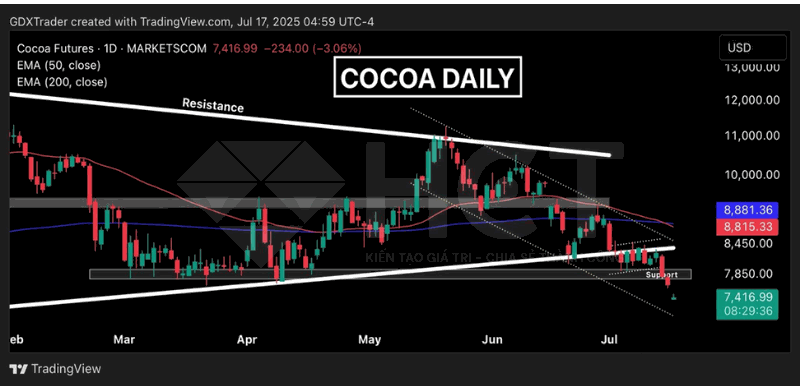 3. Giá ca cao mở cửa phiên giao dịch hôm thứ Năm với khoảng Gap giảm mạnh, tiếp tục xác nhận xu hướng giảm rõ rệt. Giá vẫn di chuyển trong kênh giảm, và việc phá vỡ mô hình cờ giảm cùng nhiều vùng hỗ trợ quan trọng cho thấy đà bán vẫn chiếm ưu thế. Dù một số phiên gần đây có dấu hiệu giá muốn ổn định, chưa có mô hình đảo chiều rõ ràng xuất hiện. Nến doji phiên thứ Năm thể hiện sự do dự, nhưng chưa đủ xác nhận tín hiệu hồi phục. RSI đang tiệm cận vùng quá bán, nên có thể xuất hiện nhịp hồi kỹ thuật ngắn hạn, nhưng xu hướng chính vẫn nghiêng về phía giảm giá.