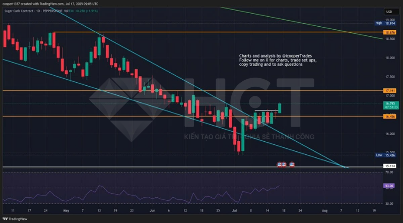 2. Giá đường tăng 1.5% trong phiên giao dịch đầu ngày thứ Năm. Dù còn khá sớm, nhưng đây có thể là cú phá vỡ khỏi mô hình cờ tăng như kỳ vọng. Nếu đúng, mục tiêu kháng cự tiếp theo nằm tại vùng 17.14.