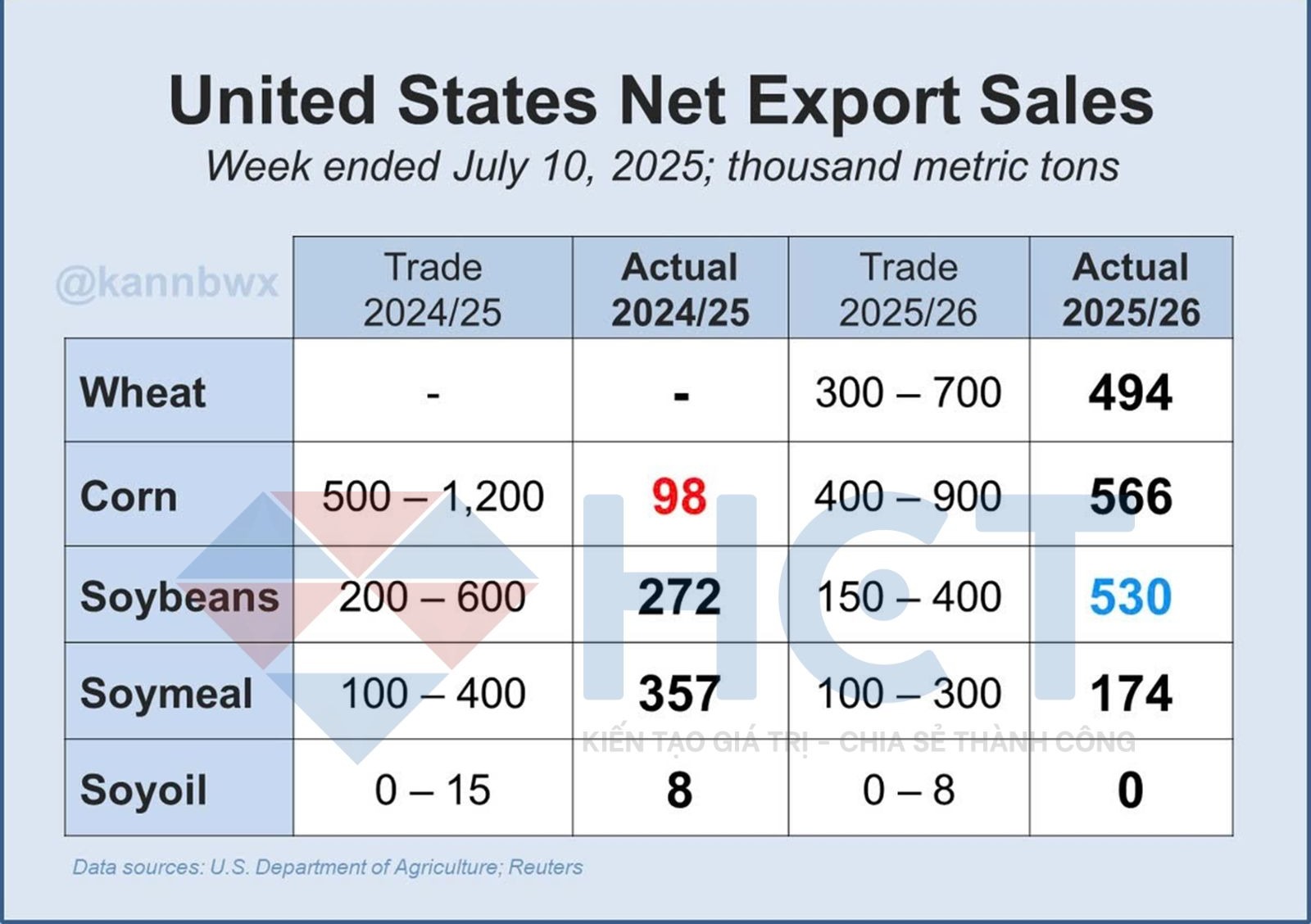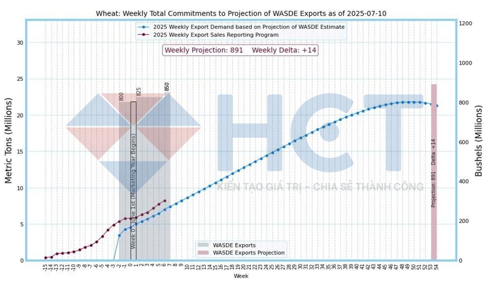 6. Xuất khẩu lúa mì vụ mới của Mỹ khởi đầu tích cực trong niên vụ 2025, với cam kết bán hàng đang vượt trên đà dự báo của WASDE. Mức tăng +14 triệu giạ trong tuần cho thấy nhu cầu ban đầu ổn định và triển vọng xuất khẩu sáng sủa.