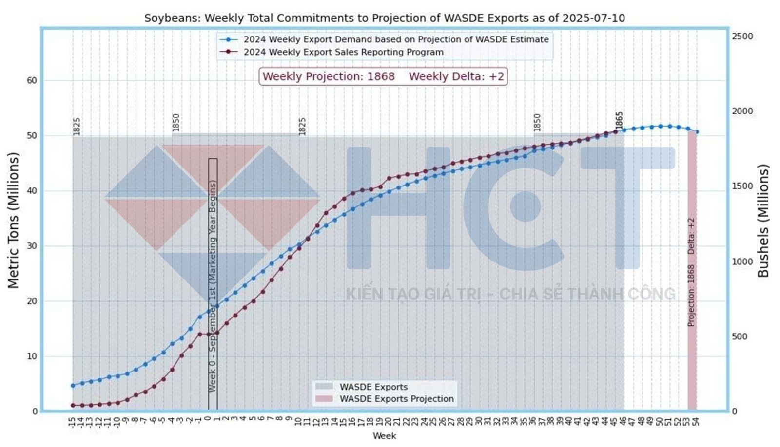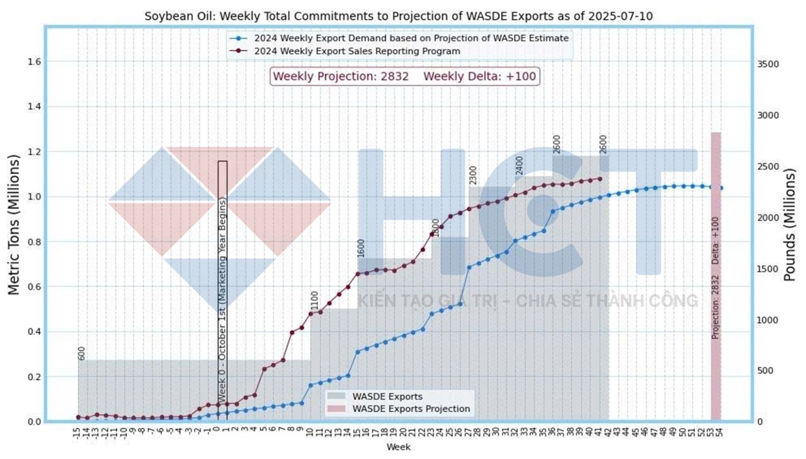 7. Xuất khẩu dầu đậu tương vụ cũ tiếp tục tăng mạnh, với cam kết vượt xa dự báo của WASDE. Tuần qua ghi nhận mức tăng đột biến +100 triệu pound, cho thấy nhu cầu xuất khẩu cuối vụ đang bứt tốc đáng kể.