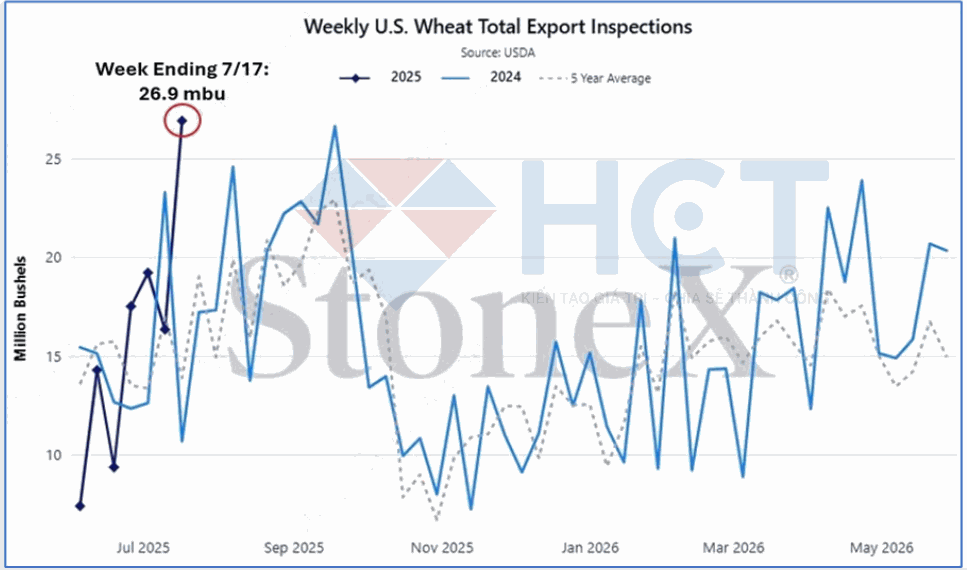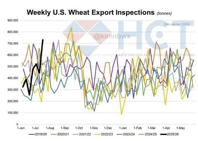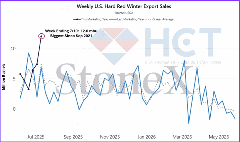 8. Doanh số lúa mì cứng đỏ Mỹ trong tuần qua đạt 12,0 triệu giá – mức cao nhất trong gần 4 năm, với Hàn Quốc và Mexico là hai thị trường mua chính.