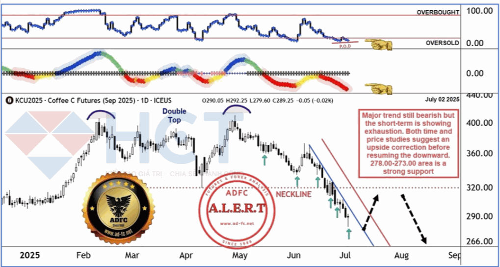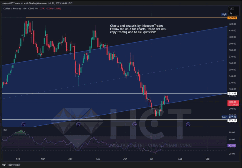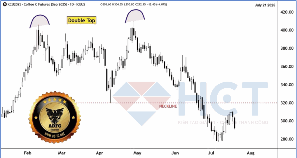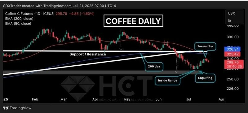 2. Biểu đồ cà phê xuất hiện mô hình “tweezer top” vào thứ Năm tuần trước, cảnh báo sớm đà tăng đang suy yếu khi giá không thể vượt đỉnh lần hai. Nến giảm mạnh vào thứ Sáu xác nhận lực bán đang quay trở lại. Diễn biến giảm tiếp tục vào thứ Hai cho thấy áp lực bán gia tăng rõ rệt. Với những ai đã vào lệnh mua từ ngày 10/7, đây là thời điểm quan trọng để quản lý rủi ro, vì nhịp hồi hiện tại đang yếu và nguy cơ điều chỉnh sâu hơn đang tăng lên. Nhà đầu tư nên xem xét siết chặt dừng lỗ hoặc chốt lời nếu xu hướng giảm tiếp tục.