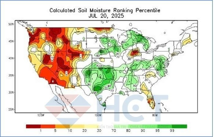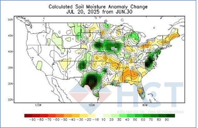 3. Tình trạng hạn hán tại vành đai ngô Mỹ gần đây không còn đáng lo ngại, đặc biệt khi Iowa và miền đông Nebraska đã trở nên ẩm ướt hơn rõ rệt trong ba tuần qua. Dù độ ẩm đất đã được cải thiện, đậu tương vẫn cần mưa đều trong suốt tháng Tám để đảm bảo sinh trưởng tốt.