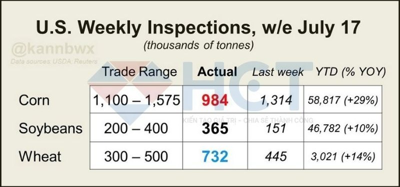 4. Kiểm tra xuất khẩu lúa mì Mỹ tuần qua gây bất ngờ khi vượt xa dự báo và đạt mức cao nhất kể từ năm 2008. Trong khi đó, kiểm tra xuất khẩu ngô giảm mạnh, thấp nhất kể từ đầu tháng 1 và dưới kỳ vọng. Đậu tương có kết quả ổn định, nhưng không ghi nhận lô hàng nào xuất sang Trung Quốc.