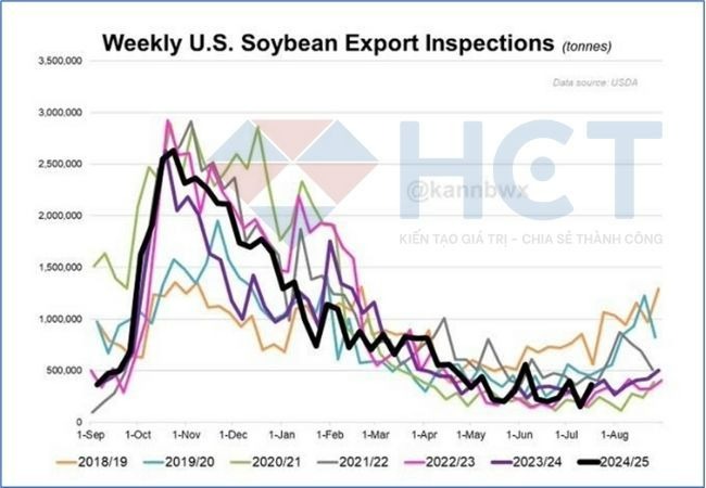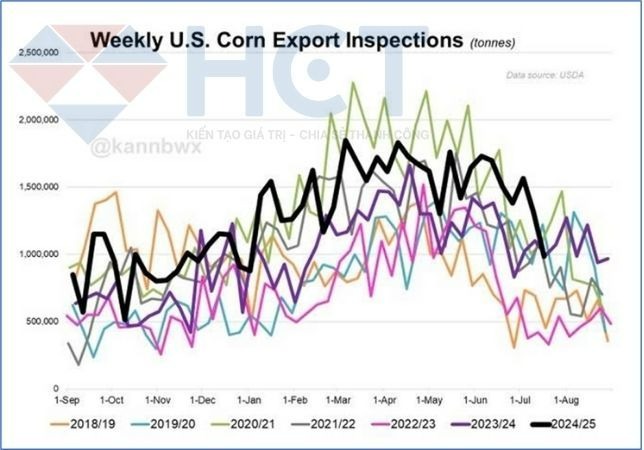 5. Khối lượng lúa mì được kiểm tra từ đầu năm đến nay đã tăng mạnh, từ -3% lên +14% chỉ sau một tuần. Đậu tương tiếp tục ổn định, trong khi kiểm tra xuất khẩu ngô lại thuộc nhóm thấp nhất năm so với trung bình và kỳ vọng.