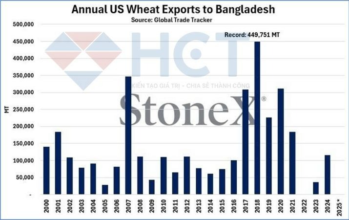 6. Bangladesh vừa ký thỏa thuận nhập khẩu 700.000 tấn lúa mì Mỹ mỗi năm trong 5 năm tới, đánh dấu mức tăng mạnh so với khối lượng xuất khẩu thông thường trước đây. Con số này cao hơn khoảng 250.000 tấn so với kỷ lục từng đạt được vào năm 2018.