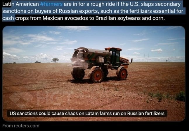 9. Ngành nông nghiệp Mỹ Latinh đang đối mặt rủi ro lớn nếu Mỹ áp lệnh trừng phạt thứ cấp lên các bên mua hàng hóa từ Nga, đặc biệt là phân bón – yếu tố thiết yếu cho cây trồng xuất khẩu như bơ Mexico, đậu nành và ngô Brazil. Việc thiếu hụt phân bón có thể gây gián đoạn sản xuất và làm tăng chi phí, ảnh hưởng nghiêm trọng đến chuỗi cung ứng nông sản toàn cầu.