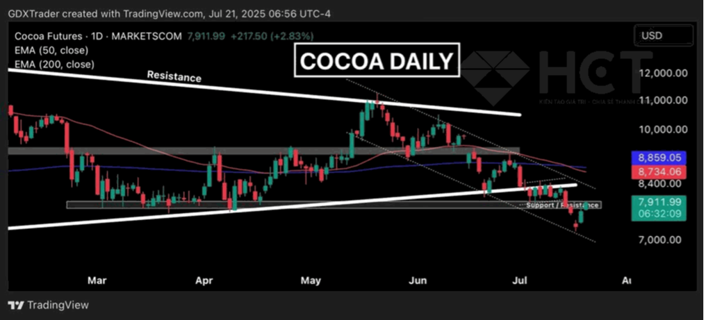1. Giá ca cao đang cho tín hiệu tích cực khi giữ vững vùng hỗ trợ tại đáy kênh giảm. Nến "spinning top" xuất hiện cuối tuần trước cho thấy lực bán suy yếu, và ngay sau đó là một nến tăng mạnh xác nhận sự quay lại của lực mua. Diễn biến phiên giao dịch hôm thứ Hai tiếp tục củng cố đà tăng, với nến tăng không có bóng phản ánh áp lực mua mạnh và ít do dự trong phiên. Tâm lý thị trường đang chuyển từ thận trọng sang lạc quan, mở ra khả năng đảo chiều xu hướng nếu giá vượt kháng cự kênh giảm trong những phiên tới.