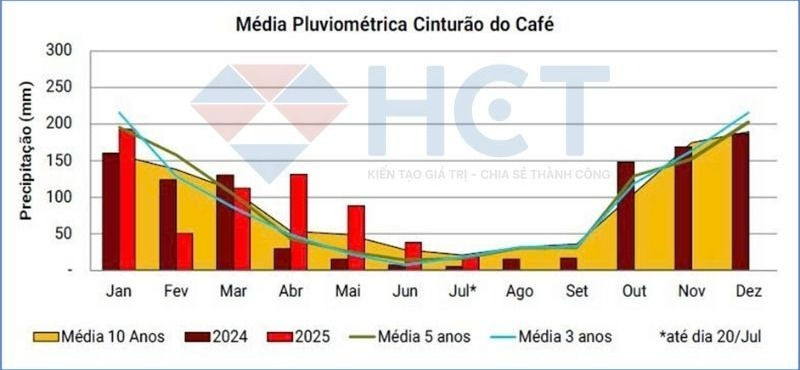 6. Biểu đồ từ LSEG cho thấy độ ẩm đất tại Nam Minas Gerais – khu vực sản xuất cà phê trọng điểm của Brazil. Đường màu đỏ thể hiện dữ liệu năm 2025 và cho thấy điều kiện độ ẩm hiện tại khá ổn, đặc biệt khi đang trong giai đoạn giữa mùa khô.