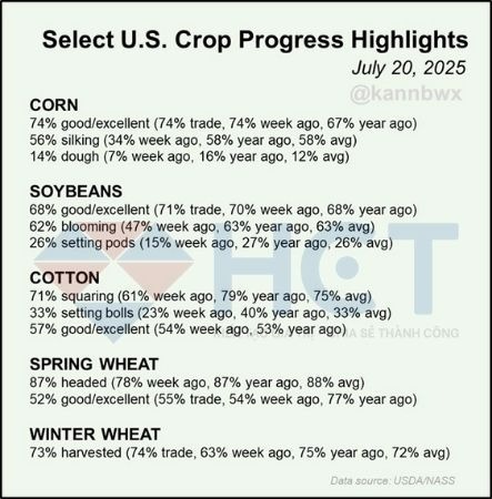 2. Tại Mỹ, tình trạng cây ngô giữ nguyên so với tuần trước, đúng như dự báo. Tuy nhiên, chất lượng đậu tương bất ngờ giảm, trái ngược với kỳ vọng sẽ được cải thiện nhẹ. Tương tự, xếp hạng lúa mì xuân cũng suy giảm so với dự đoán.