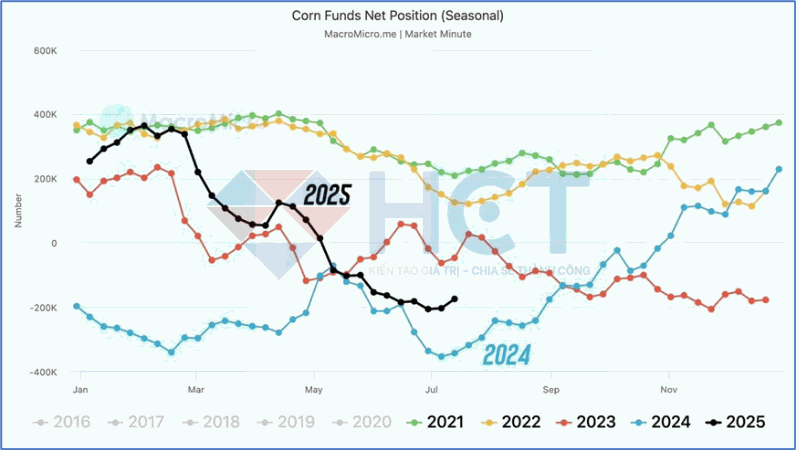 2. Trong hai tuần liên tiếp, các quỹ đầu tư đã quay trở lại mua vào hợp đồng ngô, đây là lần đầu tiên điều này xảy ra kể từ tháng Hai. Điều này trùng hợp đáng chú ý với thời điểm cùng kỳ năm ngoái, khi các quỹ quyết định từ bỏ vị thế bán khống của họ. Hiện tại, các quỹ đang nắm giữ vị thế bán khống lớn thứ hai trong vòng một thập kỷ đối với thời điểm này trong năm, chỉ xếp sau kỷ lục bán khống đã thiết lập vào năm ngoái. Diễn biến này cho thấy thị trường có thể đang ở giai đoạn chuyển mình quan trọng, đặc biệt nếu xu hướng mua vào tiếp tục được duy trì trong thời gian tới.