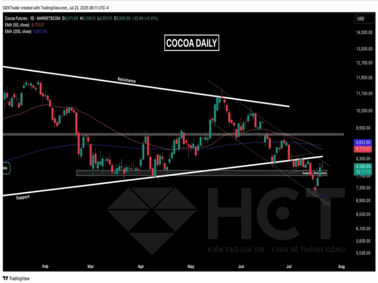 1. Giá ca cao hiện đang chạm ngưỡng kháng cự của kênh giảm và tạo ra cây nến doji, phản ánh sự do dự của thị trường khi phe mua và phe bán giằng co mà không bên nào chiếm ưu thế. Mô hình này cho thấy người bán chưa thể đẩy giá xuống rõ ràng, trong khi phe mua cần giữ giá trên hỗ trợ gần nhất và hình thành mô hình tiếp diễn tích cực như cờ tăng hoặc vùng tích lũy. Diễn biến này cho thấy thị trường đang hấp thụ cung ổn định và nếu người mua tiếp tục mạnh mẽ, đà tăng có thể được duy trì.
