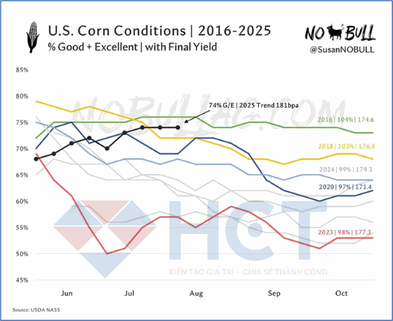 3. Xếp hạng chất lượng cây ngô hiện tại vẫn đang duy trì ở mức cao nhất từng được ghi nhận cho thời điểm này trong mùa sinh trưởng. Theo dữ liệu lịch sử, những năm có chất lượng tương tự thường cho năng suất vượt xu hướng trung bình. Cụ thể, năm 2016 đạt 104% so với xu hướng và năm 2018 đạt 103%. Dựa trên xu hướng năng suất năm 2025 là 181 giạ mỗi mẫu Anh, cứ mỗi 1% chênh lệch so với mức này dù tăng hay giảm sẽ tương ứng với khoảng 160 triệu giạ được cộng thêm hoặc trừ đi khỏi tổng sản lượng. Điều này cho thấy chất lượng mùa vụ hiện tại có thể có tác động đáng kể đến nguồn cung cuối vụ.