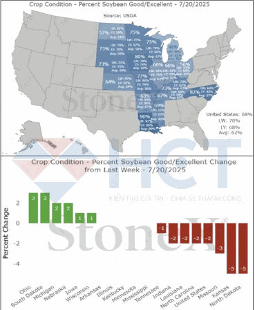 5. Báo cáo Tiến độ Mùa vụ từ Bộ Nông nghiệp Hoa Kỳ công bố vào chiều qua cho thấy chất lượng đậu tương tại Mỹ bất ngờ giảm 2% so với tuần trước, hiện chỉ còn 68% diện tích được đánh giá đạt mức Tốt đến Xuất sắc. Điều này trái ngược hoàn toàn với kỳ vọng của thị trường, vốn dự đoán chất lượng sẽ được cải thiện và tăng lên 71%. Sự sụt giảm chủ yếu đến từ các bang Bắc Dakota và Kansas, nơi chất lượng giảm mạnh tới 5%, cùng với mức giảm 3% ghi nhận tại bang Missouri. Đây là những yếu tố chính kéo xếp hạng chất lượng chung toàn quốc xuống dưới kỳ vọng.