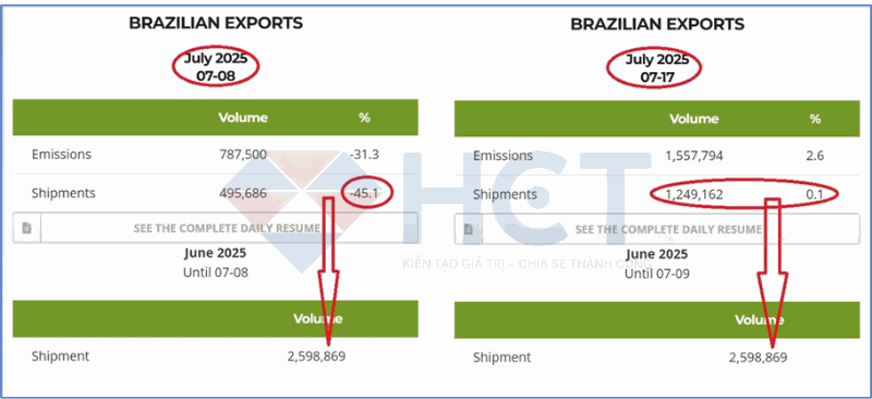 3. Brazil’s Cecafe đã tạm ngừng báo cáo xuất khẩu hàng ngày trong 8-10 ngày, nhưng số liệu mới nhất đến 21/7 cho thấy xuất khẩu chỉ tăng nhẹ so với tháng trước, không so sánh cùng kỳ năm trước. Dù xuất khẩu tháng 7 có thể tăng khoảng 10% so với tháng 5, tổng lượng xuất khẩu vẫn dự kiến giảm đến 32% so với cùng kỳ năm ngoái, xuống còn khoảng 2,86 triệu bao. Đây sẽ là tháng giảm thứ 7 liên tiếp của Brazil so với năm trước, trong bối cảnh tồn kho cà phê toàn cầu tại các cảng nhập khẩu chỉ còn khoảng 12-13 triệu bao, cảnh báo nguồn cung cà phê đang dần cạn kiệt.